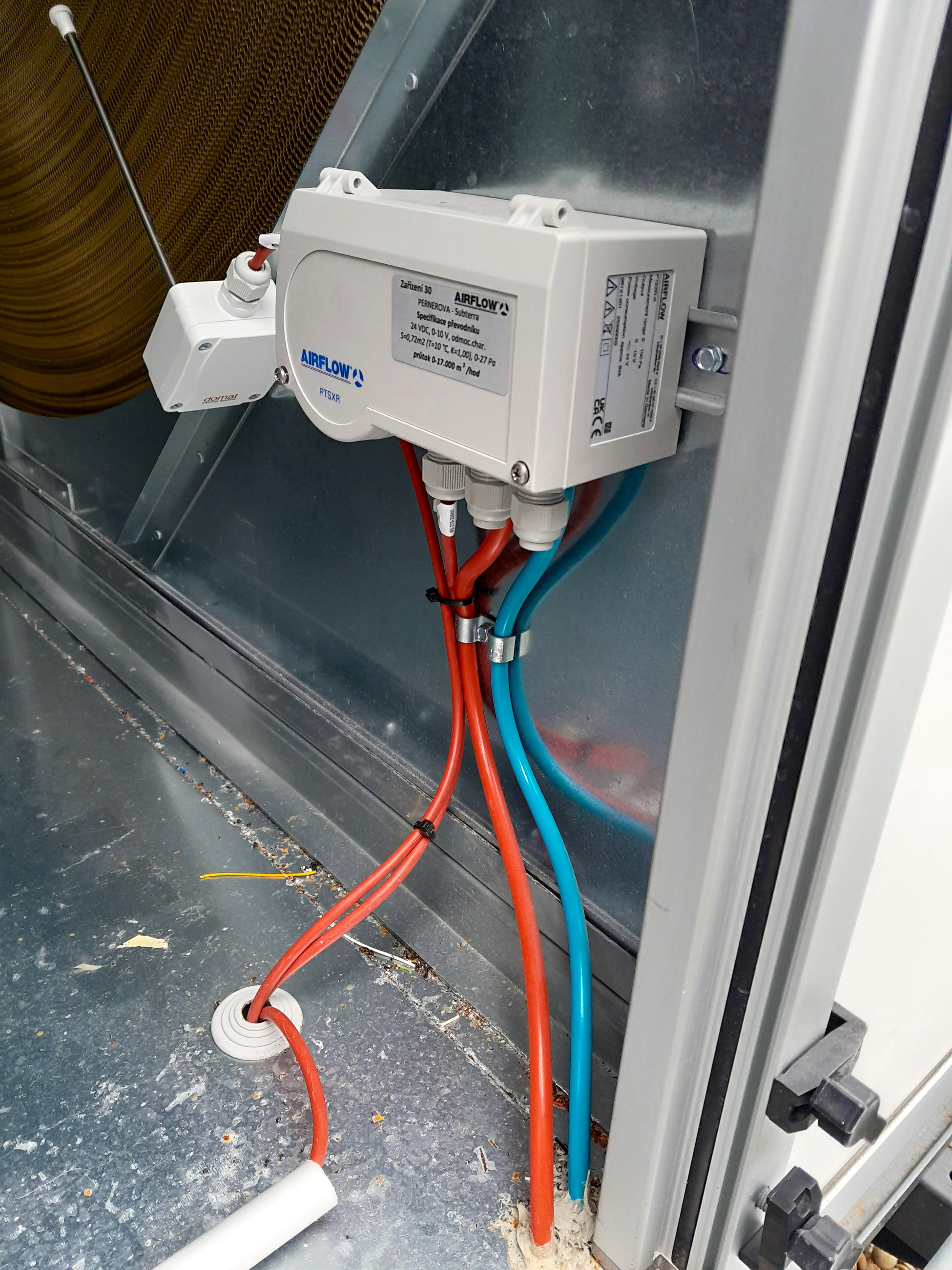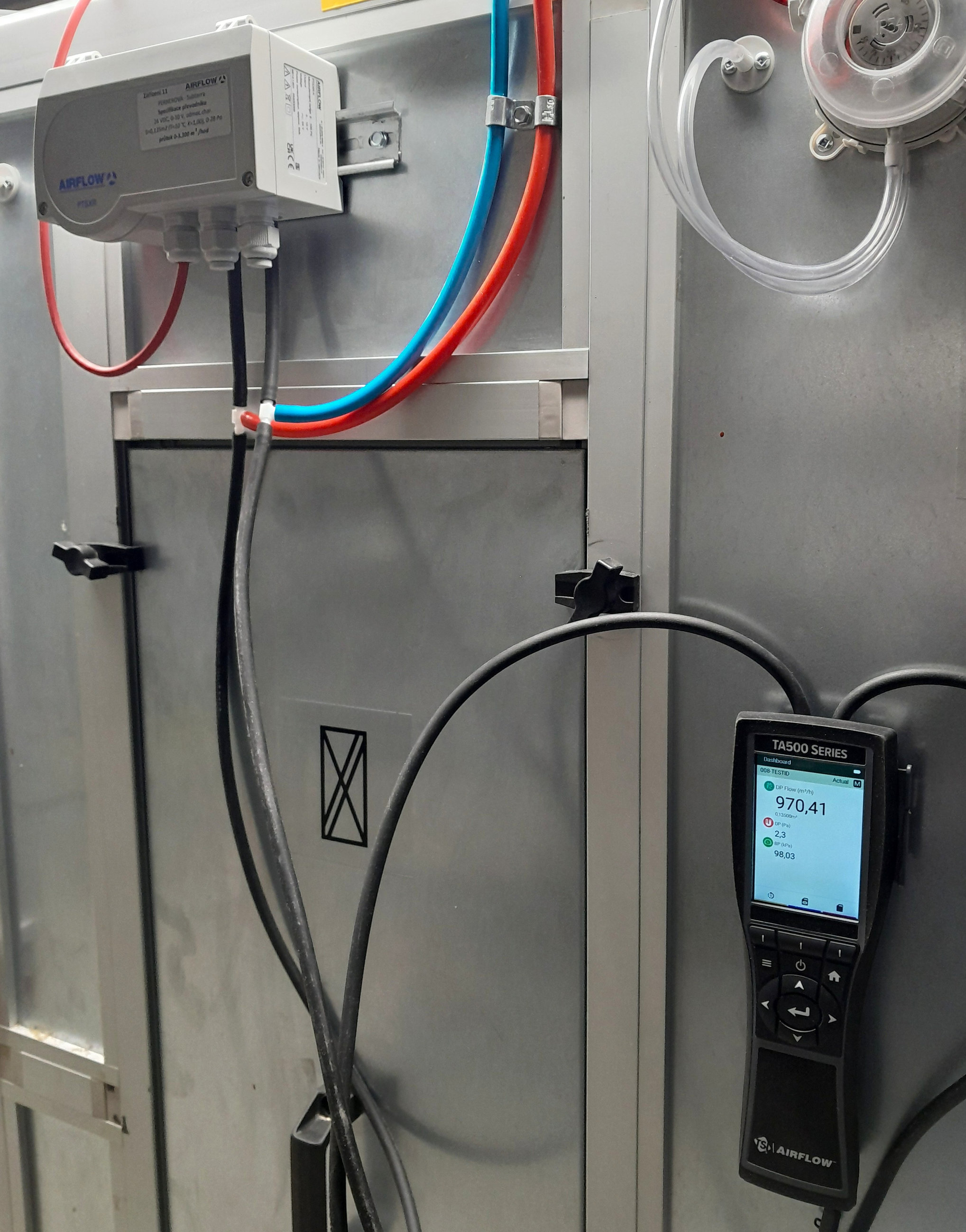 Další, neméně důležitý úkol, je najít vhodné místo pro převodník tlaku. Zatímco ocelové VS sondy bez problému zvládají teploty pod bodem mrazu, převodník potřebuje mírnější klima, protože jen při teplotách nad bodem mrazu je garantována přesnost měření. Zde se převodník nainstaloval přímo do VZT jednotky. Z fotografie je dobře patrné i vyřešení napojení PVC hadiček a elektrického napájení, včetně analogového výstupu.