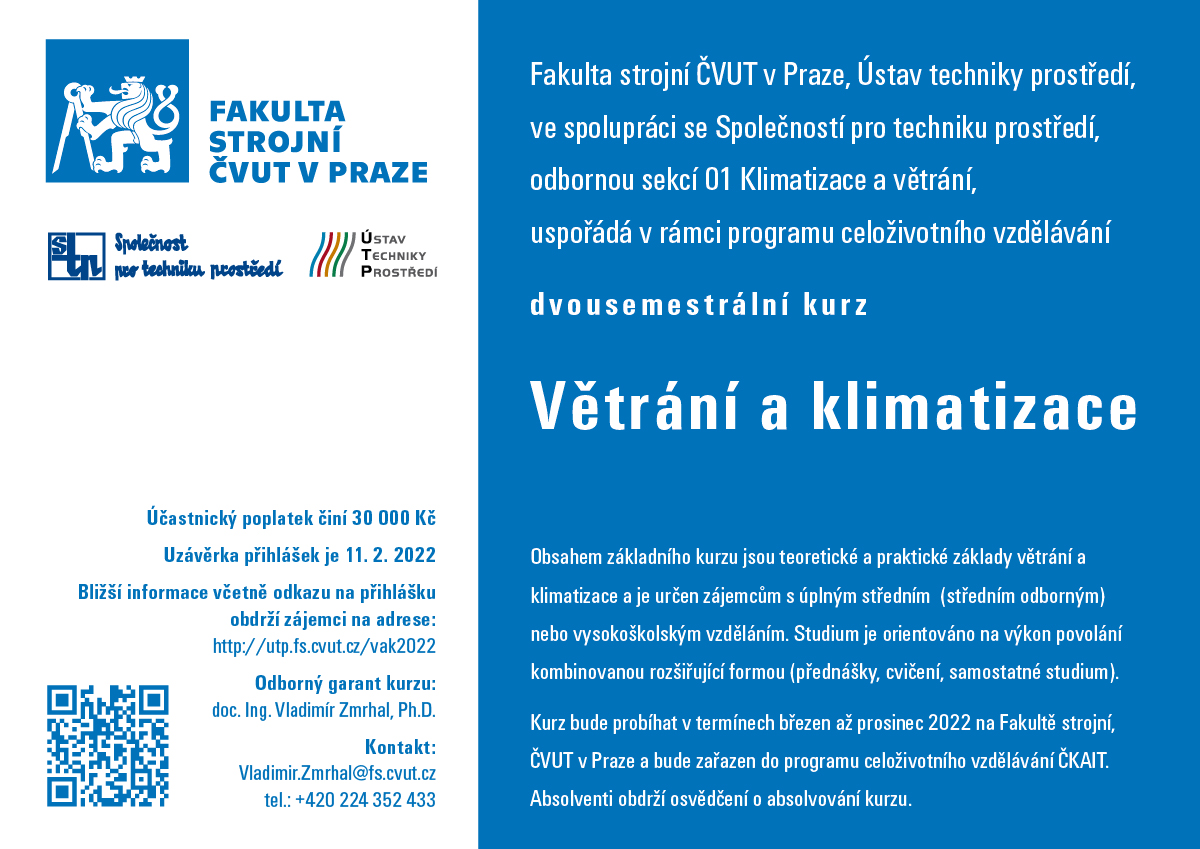 ![]() úterý 1.3.2022 Dvousemestrální kurz Větrání a klimatizace