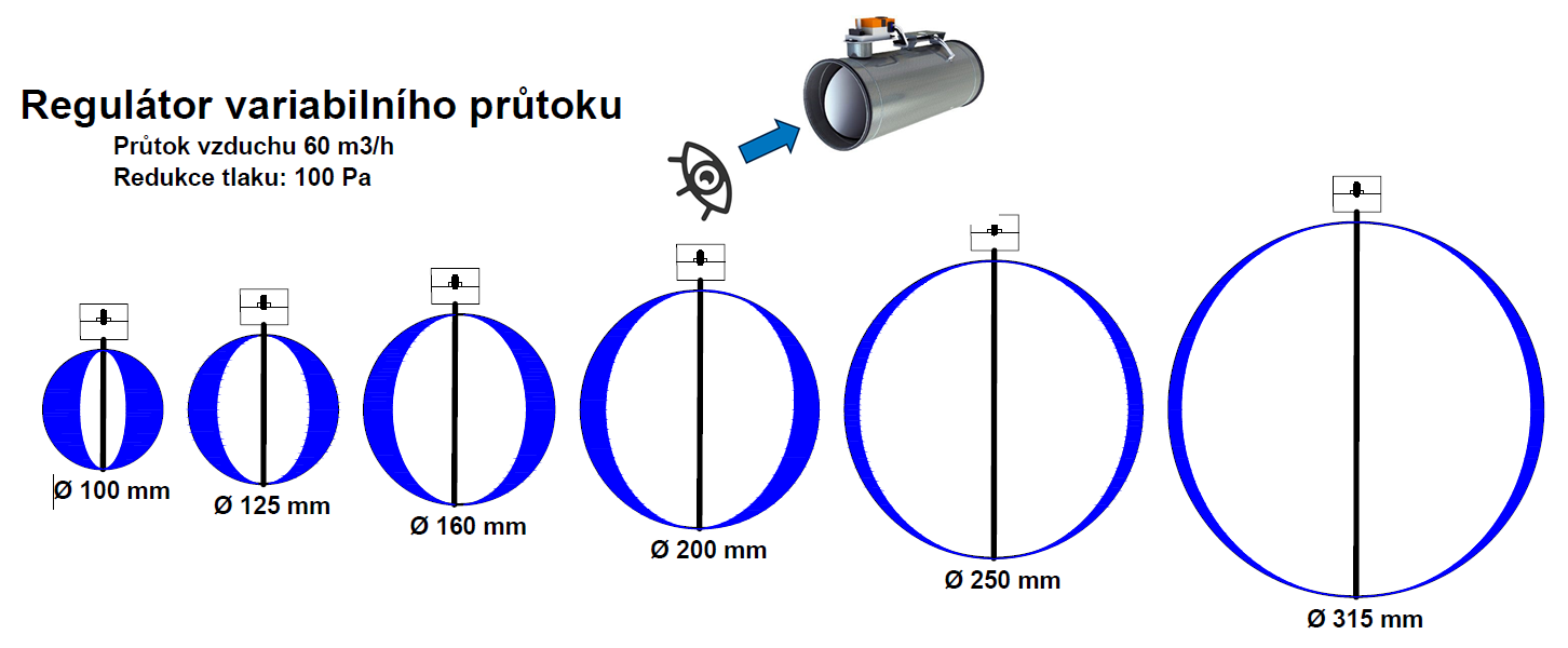Obr. 2 Volné  průřezové plochy regulátorů (modře) při stejných regulačních podmínkách