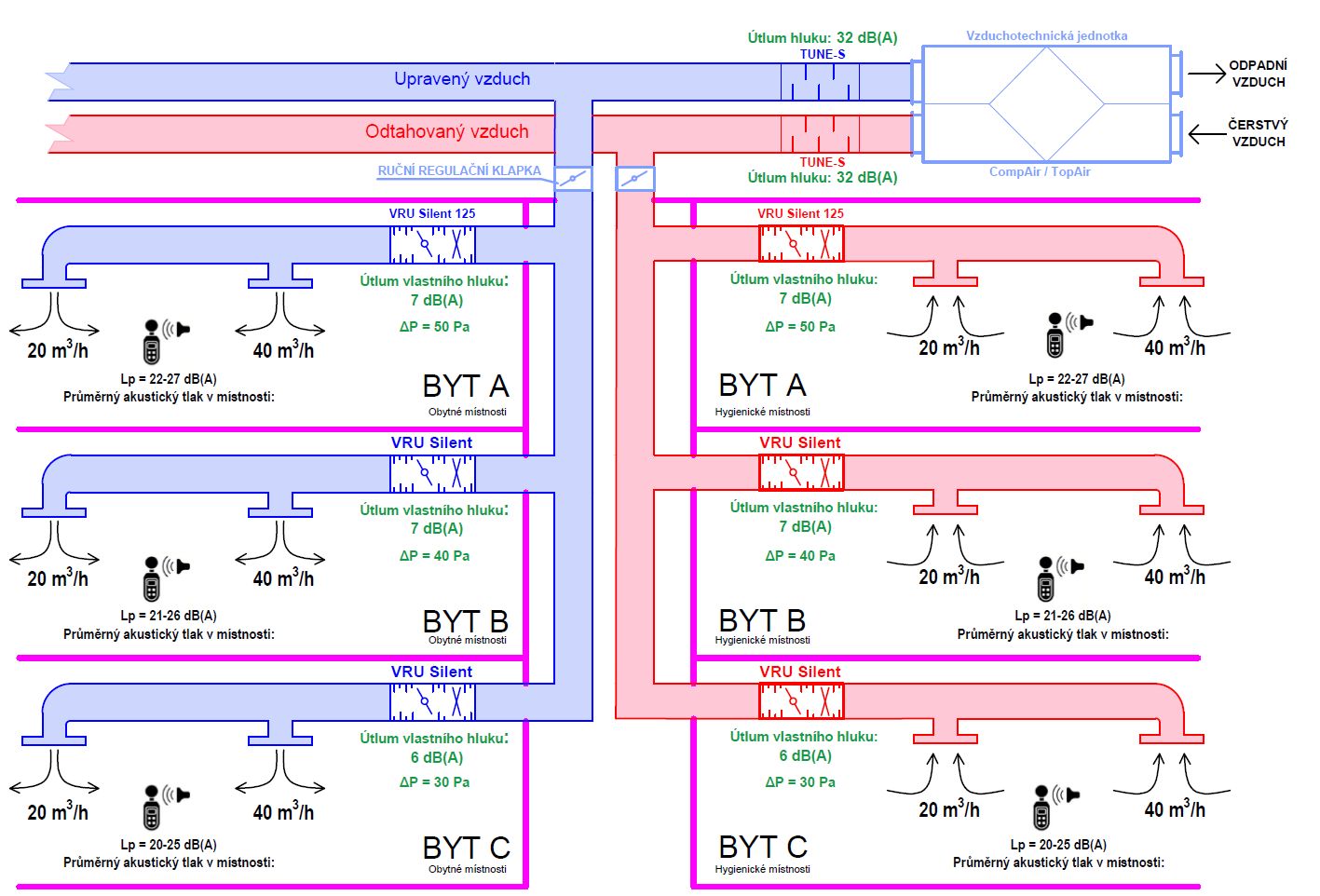 V jednotlivých bytech jsou na přívodu i na odvodu použity akustické variabilní regulátory VRU Silent v dimenzi Ø 125 mm, které regulují žádané množství vzduchu do bytu podle požadavku regulačního systému Pascal, nebo Simply Air. Z obrázku je patrné, že největší tlakovou diferenci, neboli redukci tlaku, musí zajistit nejbližší regulátor VRU Silent v bytě A, který je nejblíže vzduchotechnické jednotce. Akustický útlum regulátorů je v tomto případě průměrně 6–7 dB(A) a výsledný akustický tlak v bytě kolísá mezi 20–27 dB(A), což je bezpečná úroveň hluku pro splnění kritéria v obytných místnostech tj. 40 dB(A) během denních a 35 dB(A) během nočních hodin. Akustický tlak je splněn za předpokladu, že se potrubní rychlost vzduchu v bytových rozvodech bude pohybovat pod 4,5 m/s.