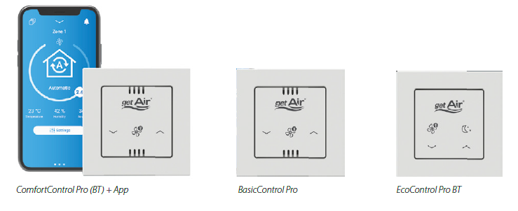 - ComfortControl Pro BT: Nejvyšší úroveň ovládání díky mobilní aplikaci getAir® a možnosti připojení senzoru kvality vzduchu. Bezdrátová komunikace.