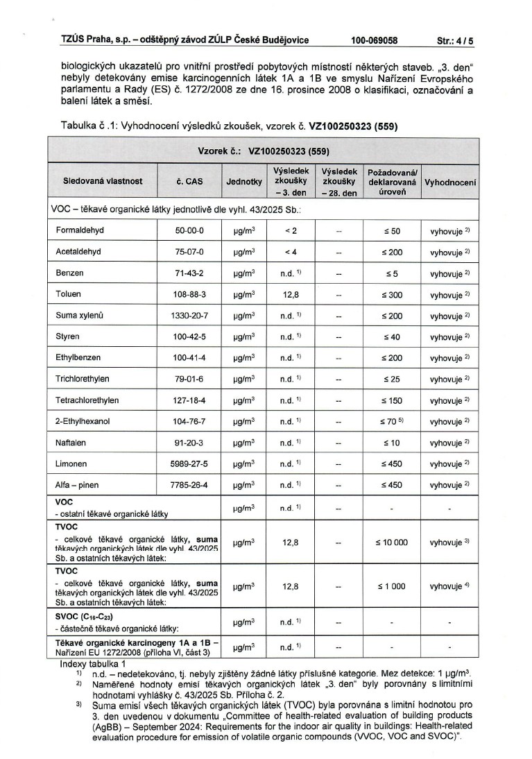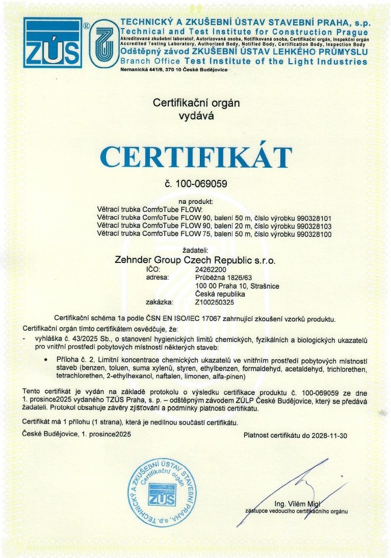 Certifikace potvrzuje splnění požadavků na chemické, fyzikální a biologické ukazatele vnitřního prostředí pobytových místností. Díky hladkému vnitřnímu povrchu a konstrukci systému je zároveň zajištěna dlouhodobá udržitelnost hygienických parametrů.