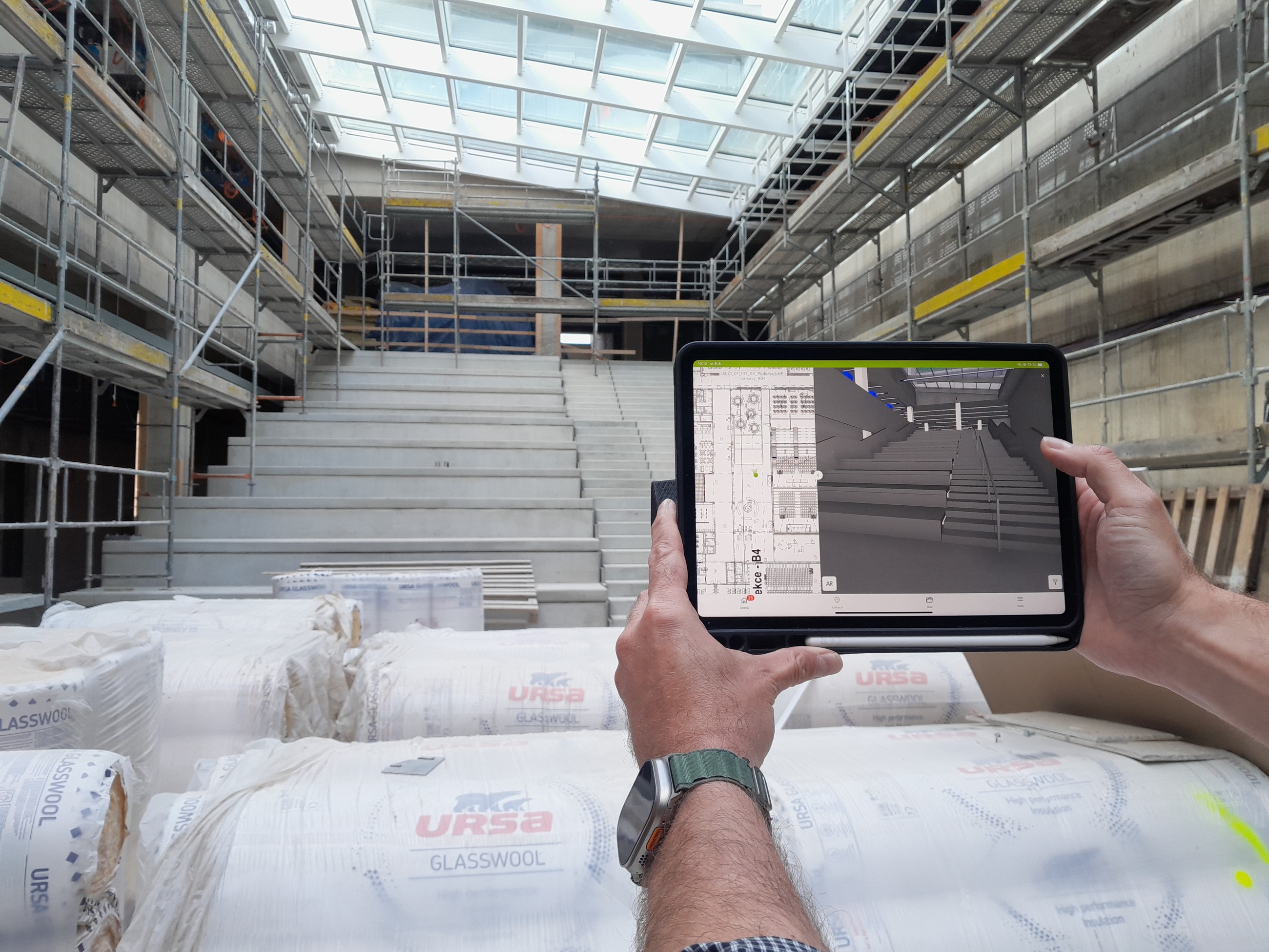 Převážnou část prohlídky jsme měli zakloněné hlavy a očima sledovaly nekonečné délky potrubních tras. Orientace v trasách, jejich vzájemné křížení mezi sebou, ale i s jinými profesními rozvody, typech izolací a mnoha dalších si v tomto případě nelze představit bez systému BIM. Samozřejmě se pro samotnou instalaci a montáž stále používá klasický výkres. Ten je prostě nepostradatelný.